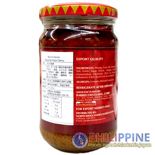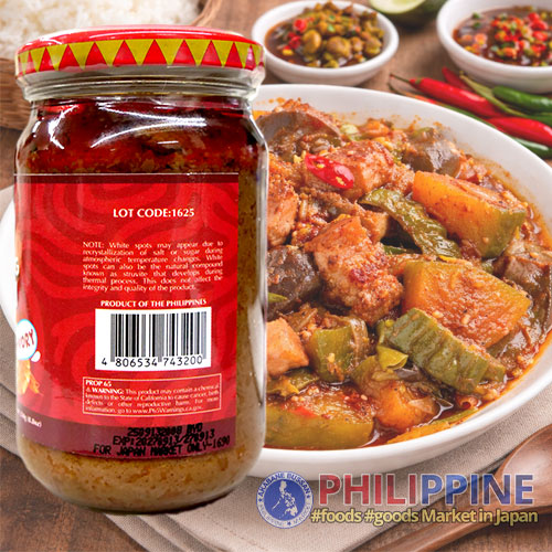 Traditional Filipino shrimp paste with a spicy kick, made from fermented shrimp for a bold and savory flavor. Perfect as a condiment or ingredient for kare-kare, green mango, and vegetable dishes. Rich, aromatic, and full of umami heat.